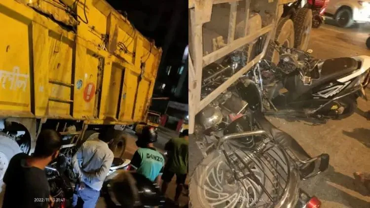 एक स्कूटी आणि रॉयल इनफिल्ड या दोन बाईक डंपरला डाव्या बाजूने विचित्रपणे धडकल्या. यातील स्कूटी ही सरळ रेषेतच डंपरच्या आतमध्ये अडकली गेली होती. तर बुलेट डंपरच्या चाकाखाली आली. यात स्कूटीसह रॉयल इनफिल्ड या दोन्ही दुचाकींचं मोठं नुकसान झालं होतं.
